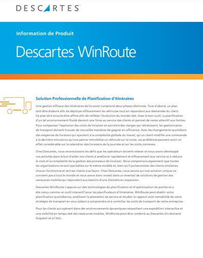 Descartes WinRoute, logiciel de Descartes, s’appuie sur des technologies de planification et d’optimisation de pointe et a été conçu comme un outil interactif pour les planificateurs d’itinéraires. WinRoute peut établir votre planification quotidienne, améliorer la prestation de service et étudier le rapport coût-rentabilité de votre stratégie de transport en vous aidant à comprendre et à contrôler les coûts de transport de votre entreprise.