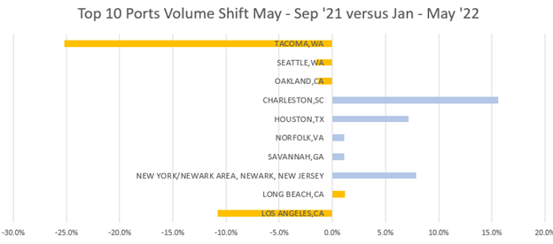 The sideways pitch and yaw in import volume swings between the top West and East Coast ports continued in May 2022, and there was more evidence of a stronger push towards smaller ports with potentially higher capacity as shippers and logistics providers played a smarter game at more effectively managing supply chain risk.