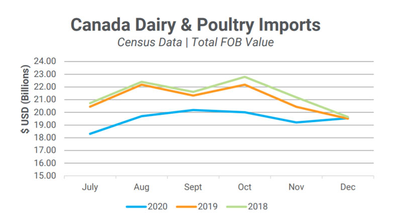 - U.S. poultry and dairy exports to Canada, thought to have the largest impact in export values by many, have only seen a mild increase compared to 2018 and 2019. In the second half of 2020, U.S. dairy farmers made up 3.6 percent of Canada’s total dairy market, up from ~1 percent under NAFTA.