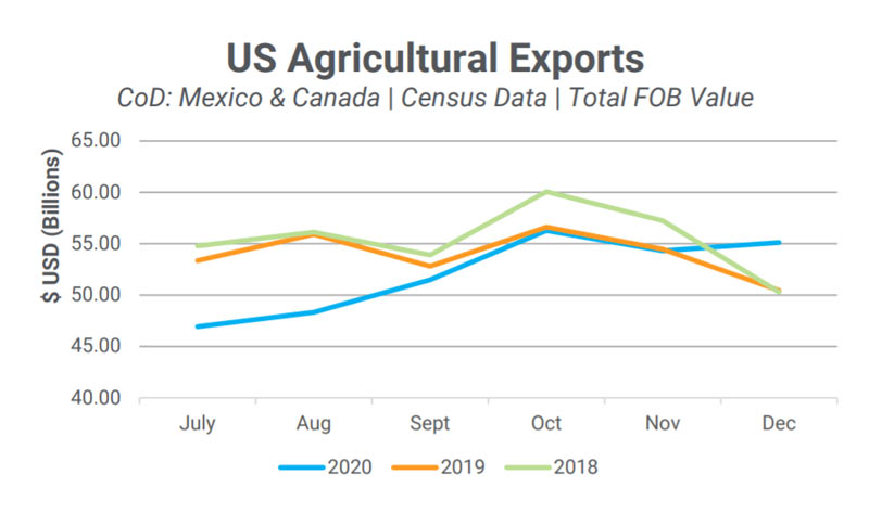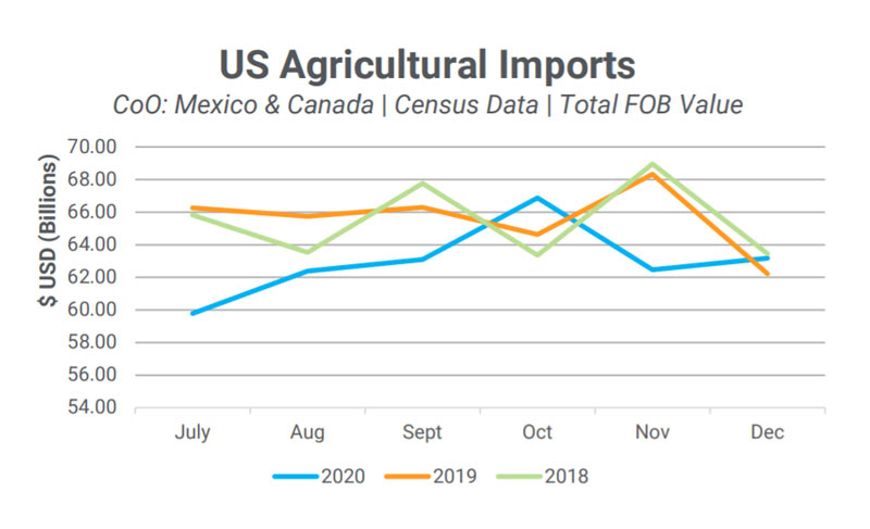 - Overall, according to Descartes import/export data and trade research, U.S. agricultural imports from Mexico and Canada lagged behind 2018 and 2019. This drop-off was temporarily halted in October and December, which had a 3.5 and 1.5 percent increase in year-over-year value respectively. The second half of 2020 had a decline in year-over-year FOB value of 4 percent for a total value of just under $378 billion USD