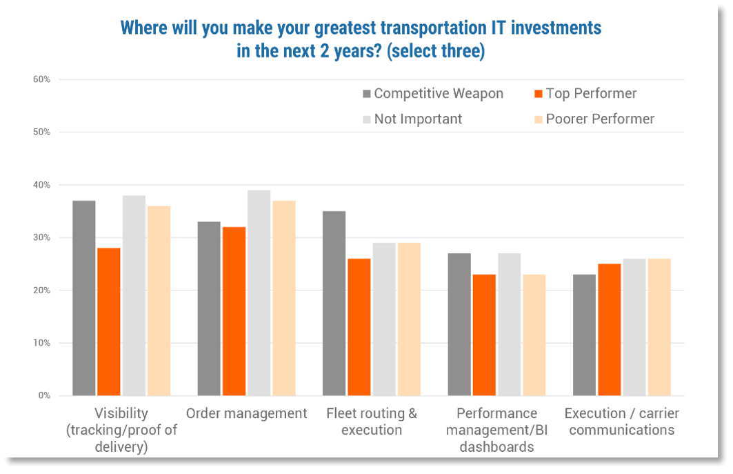 In terms of areas of focus, for the 7th consecutive year, real-time transportation visibility held the top spot for greatest transportation IT investment. Visibility was cited as the priority technology investment by 36% of respondents and was closely followed by order management at 35% in the 2nd spot. Jumping into the 3rd spot, fleet routing was noted by 29% of respondents as an important technology investment, compared to being 8th in 2023. Carrier sourcing continued to decline as an IT investment area for the 3rd year in a row, cited by only 20% of respondents and landing in the 10th spot in the capabilities rankings.