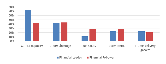 With HOS/ELD out of the way in the U.S., transportation capacity (i.e., carrier capacity and driver shortage) vaulted to the top and dominated the choices for the last 2 years. This should be no surprise to anyone and we can see the results in other questions from the benchmark, especially for Financial Leaders as they are also the ones with the greatest growth for the next 2-3 years. Fuel costs and ecommerce/home delivery were the next 2 most common choices. Continued double digit ecommerce growth is also contributing to capacity issues (see Figure 2).