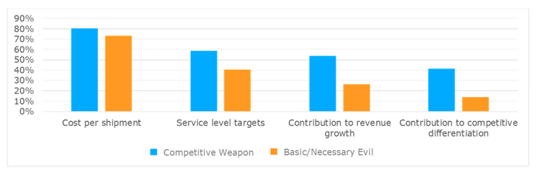 Top performers not only do better financially and grow faster, their management believes that transportation management is a competitive weapon. Never have there been examples where transportation and logistics are being used to provide differentiation and value, and where “good enough” transportation is no longer “good enough” if you are looking to be the best performing company in your industry. You can see this in Figure 1 where we compared the answers to two questions: “How is your company performing financially?” and “How strategically is transportation viewed by management?” Almost twice as many top financial performers said that management viewed transportation as a competitive weapon.