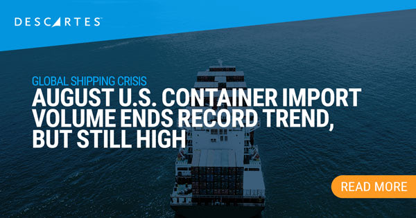 Container imports into U.S. ports in July, in 20-foot equivalent units, 18.2% greater than June volume and 2.6% higher than the year-ago level for the second highest month on record.