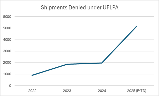The majority of UFLPA entry denials were issued in 2025, a significant increase compared to previous years. This marks a tightening of the enforcement threshold, with CBP requiring far more granular, verifiable documentation to rebut the presumption of forced labor.