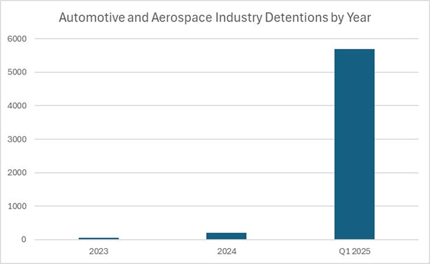 The automotive, aerospace, and electronics industries have been the most heavily impacted to date, accounting for well over half of all detained shipments.