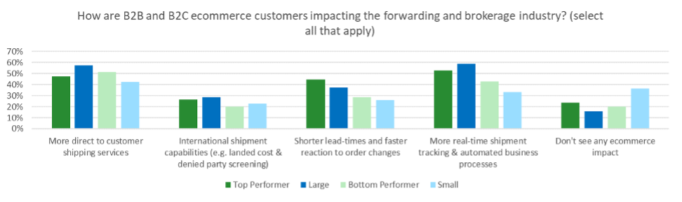 What does this tell us about who is capitalizing on ecommerce growth and making changes to get more ecommerce business? Large and better financial performers have taken advantage of ecommerce and are investing and changing to make further gains. Too many small forwarders and brokers are putting themselves at risk of missing out on one of the greatest growth opportunities of the century. In many cases, ecommerce is a “zero sum” game with respect to in-person sales, and smaller forwarders and brokers could see their market opportunity declining.