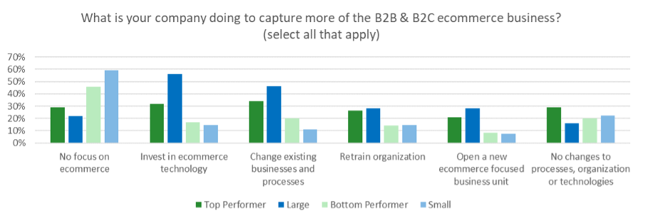 To see how ecommerce is impacting IT investment and ultimately business capability, invest in technology was the second overall response (35%) and change existing businesses and process was third overall (31%). Large respondents, however, are really gearing up to take advantage of ecommerce, citing they were almost 4X as likely to invest in technology and over 4X likely to change existing businesses and processes than small respondents (59% and 46% vs. 15% and 11% respectively). Financial performance also affected respondents’ decisions in similar fashion as top performers were almost 2X more likely to invest in technology and change existing businesses and processes than poor performers (32% and 34% vs. 17% and 20% respectively).
