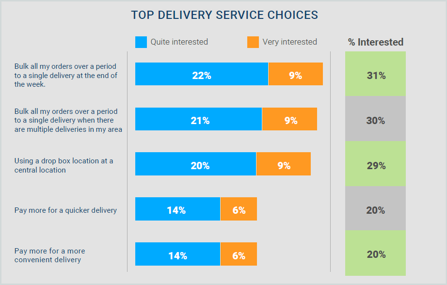 Every consumer has a home delivery persona. For example, some consumers want delivery as fast as possible, others cheapest and still others the most environmentally friendly way. In the survey, we asked consumers to indicate their level of interest in different delivery-related services and the top three services had positive environmental implications.
