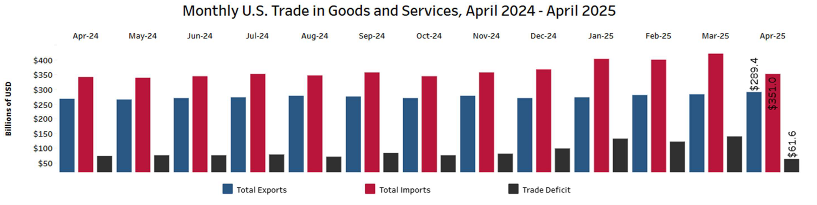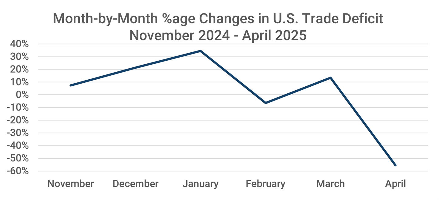 - The U.S. monthly deficit dropped 55% from March to April due to importers frontloading shipments—with China imports playing a major role in the surge.
