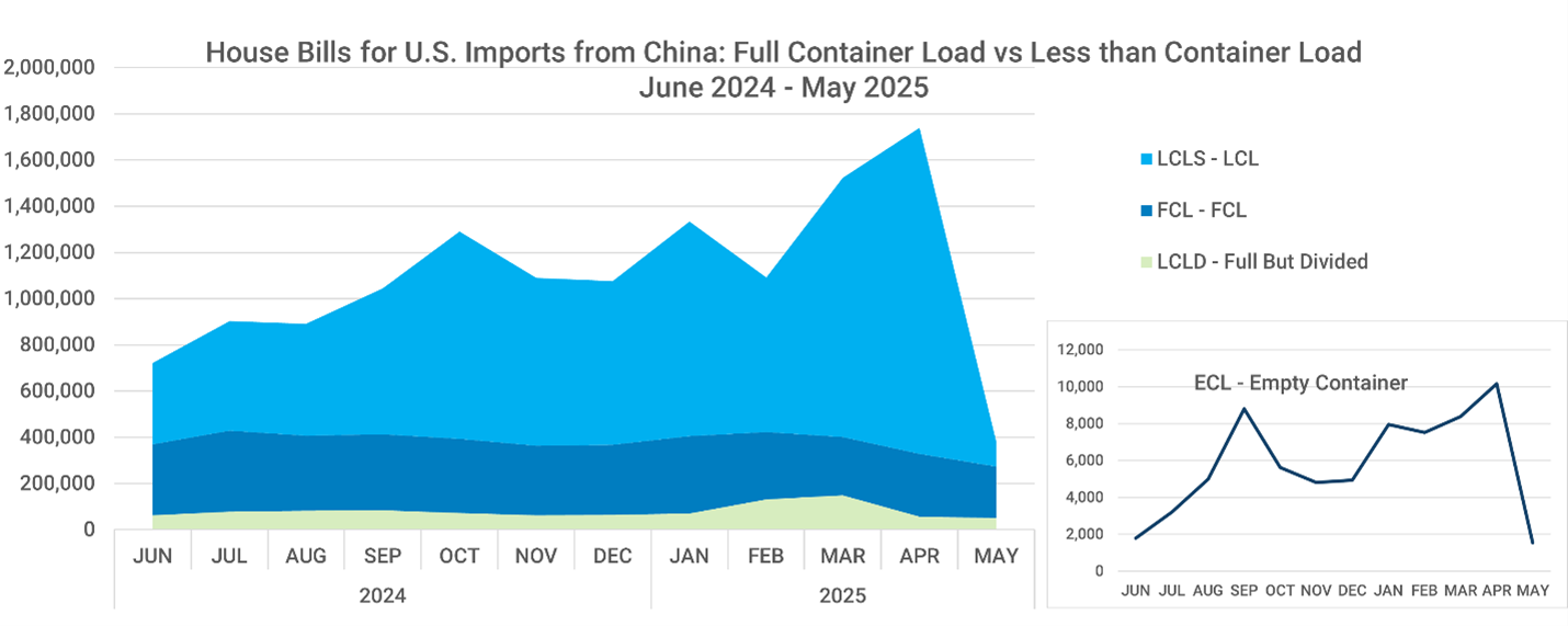 - Less-than-container-load (LCL) shipments increased, especially from China, as companies tried to minimize tariff exposure—a notable shift in China import strategies.