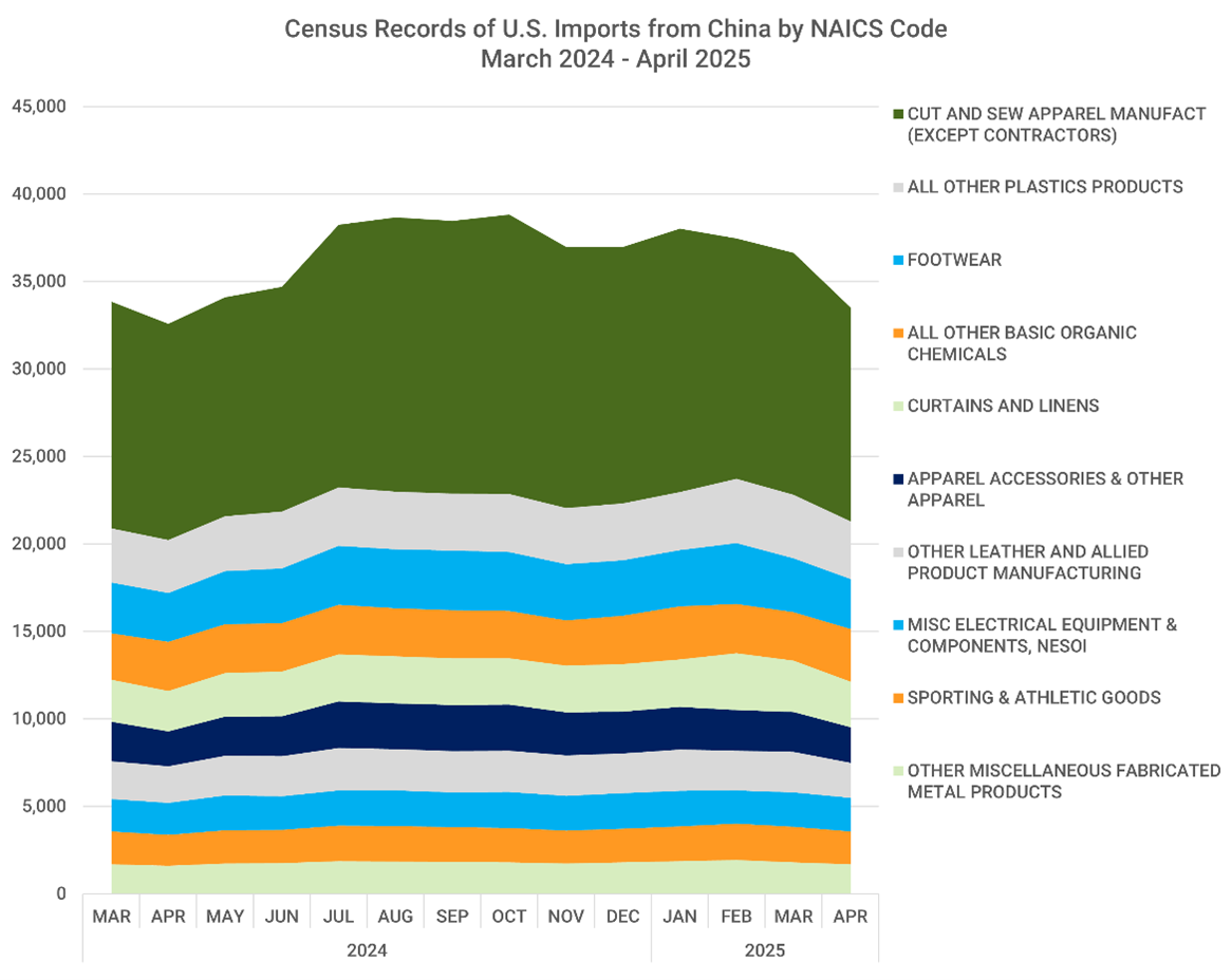 As the data chart indicates, apparel, footwear, and accessories together accounted for the largest share of individual shipments from China through the end of April 2025—underscoring the importance of China imports in key retail categories.