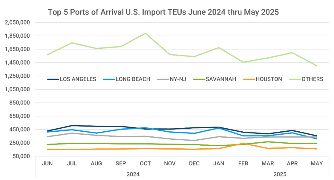 Figure 13 Monthly TEU Volumes Arriving at Top U.S. Ports June 2024 through May 2025