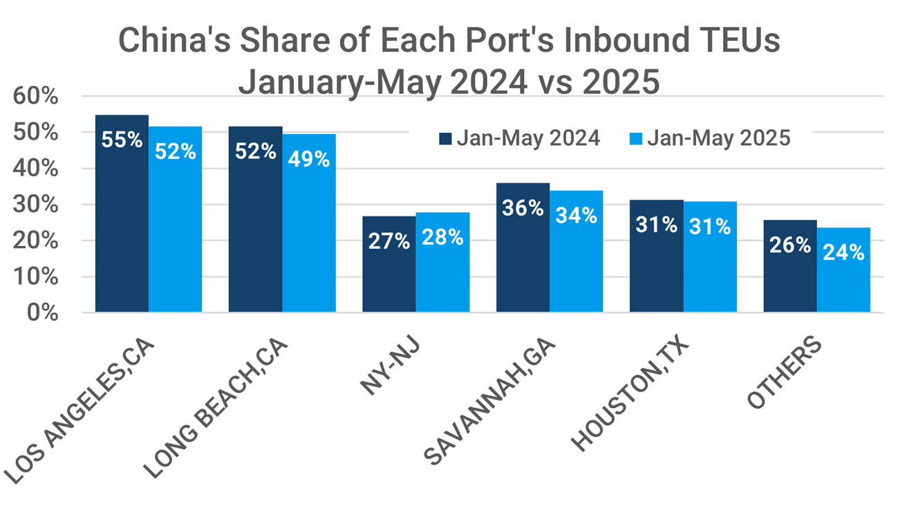 Here’s a comparison of China’s share of imports arriving at each of the top ports year-to-date (YTD) 2025 compared with the same period in 2024:
