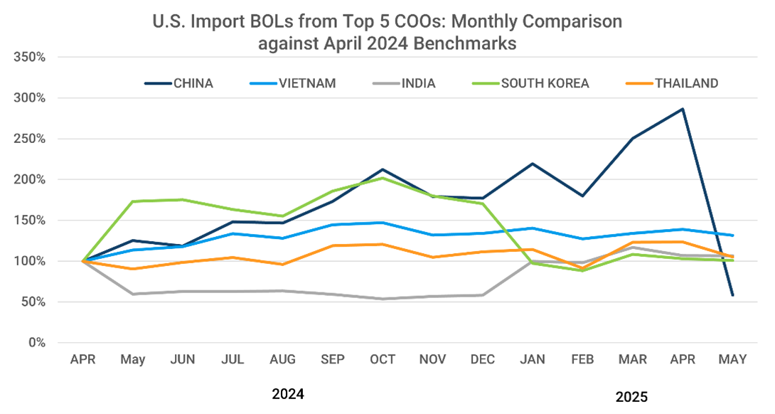 The next chart traces the monthly rise or fall in BOL records of U.S. import shipments from the top Countries of Origin (COOs) as compared with each country’s April 2024 tally (this benchmark is set in the vertical axis at 100%). China’s leading role in boosting the sheer number of shipments through April 2025 is evident.