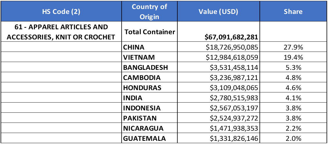 Goods category, HS-61 (Apparel Articles and Accessories, Knit or Crochet)