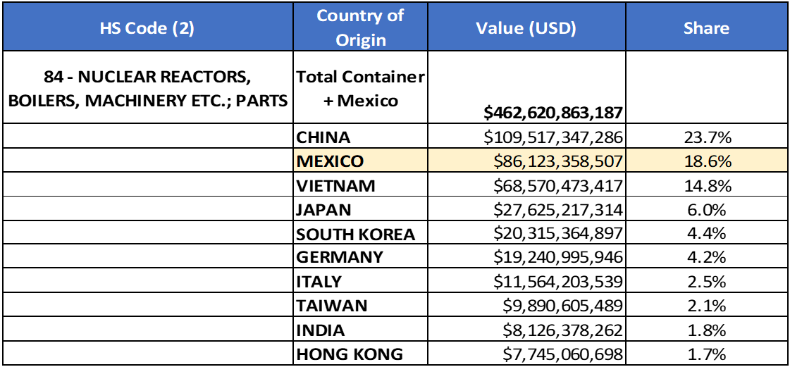 Goods category HS-84 (Nuclear Reactors, Boilers, Machinery, etc.)