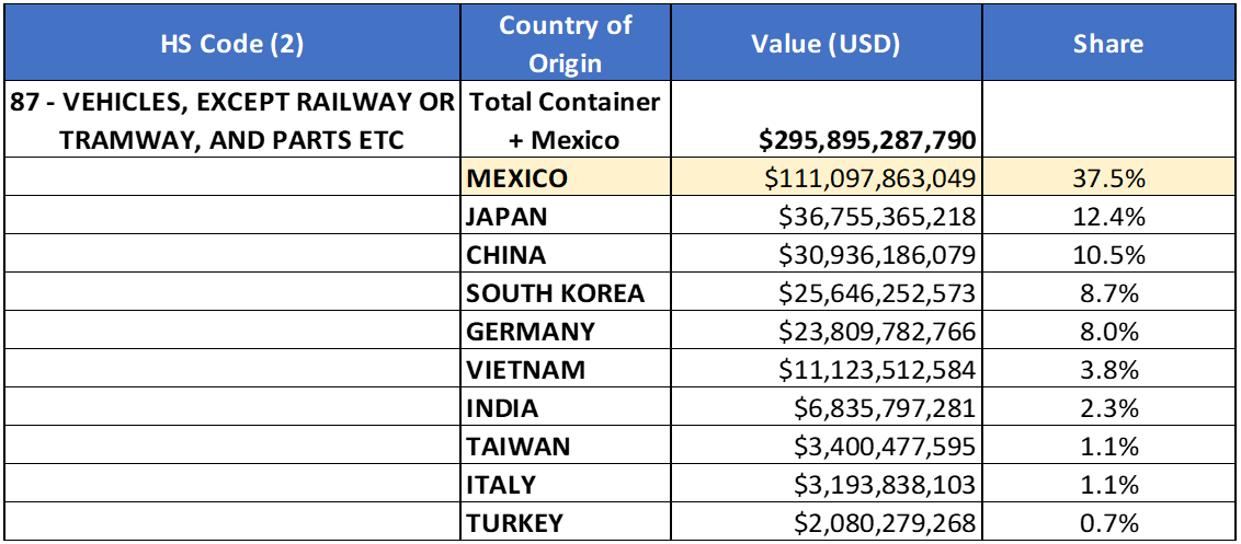In 2022, Mexico was the largest provider (38%) of HS-87 goods (see Figure 6) in terms of value to the U.S. Over a seven-year horizon (2016–2022), the total value of goods from Mexico increased 49% and the greatest percentage growth was in 2022 (23% YoY). The value of U.S. maritime imports increased 30% in the same seven-year period. This would imply that Mexico gained import market share over the last seven years. One important point to consider is that $74 billion of the $111 billion in imports from Mexico is from goods (i.e., parts, subassemblies, etc.) that were shipped from the U.S. to Mexico and used in the final assembly of automobiles in Mexico, which were then shipped back to the U.S.