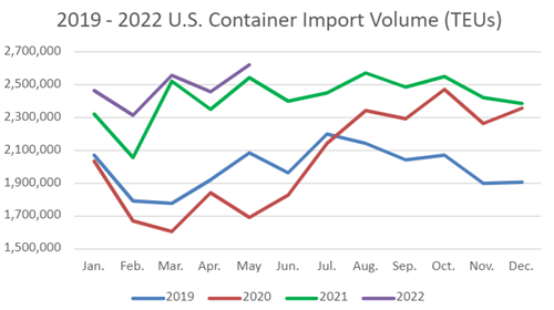 Fueled by continued strong consumer spending, May container import volumes surpassed 2.62M twenty-foot equivalent units (TEU), which not only continues the record monthly trend for the year but also eclipses the 2.6M TEU level for the first time (see Figure 1). Container imports for the month crept up 7% over April and, in contrast to previous years, were up 3% over May 2021 and 26% over pre-pandemic May 2019.