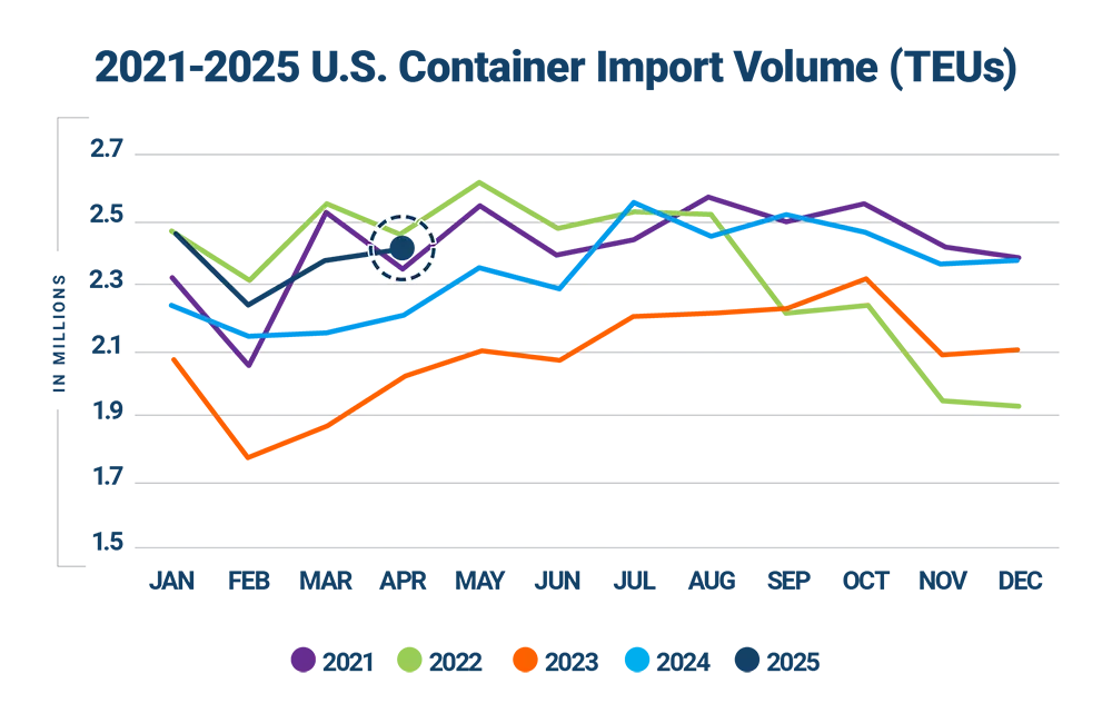 In April 2025, U.S. container import volumes remained robust, reaching 2,410,371 TEUs—an increase of 1.2% over March (see Figure 1). Year-over-year, April volumes were 9.1% higher than April 2024 and stood 25.6% above April 2019, underscoring continued strength compared to both recent and pre-pandemic levels. Cumulatively, imports for the first four months of 2025 were up 8.6% compared to the same period in 2024, showing resilience even as elevated tariffs and geopolitical risks add new pressures to global trade.