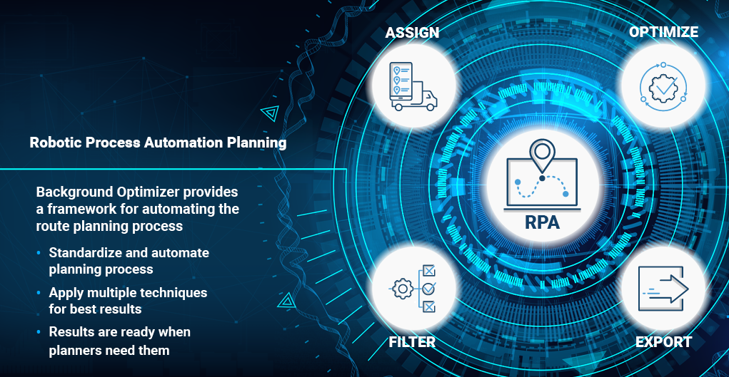 As part of Descartes Route Planner, Descartes Background Optimizer (BGO) uses RPA to make every planner as good as the best planner. Its bot structure allows planners to configure complex planning and coordination tasks across multiple planning schedules.