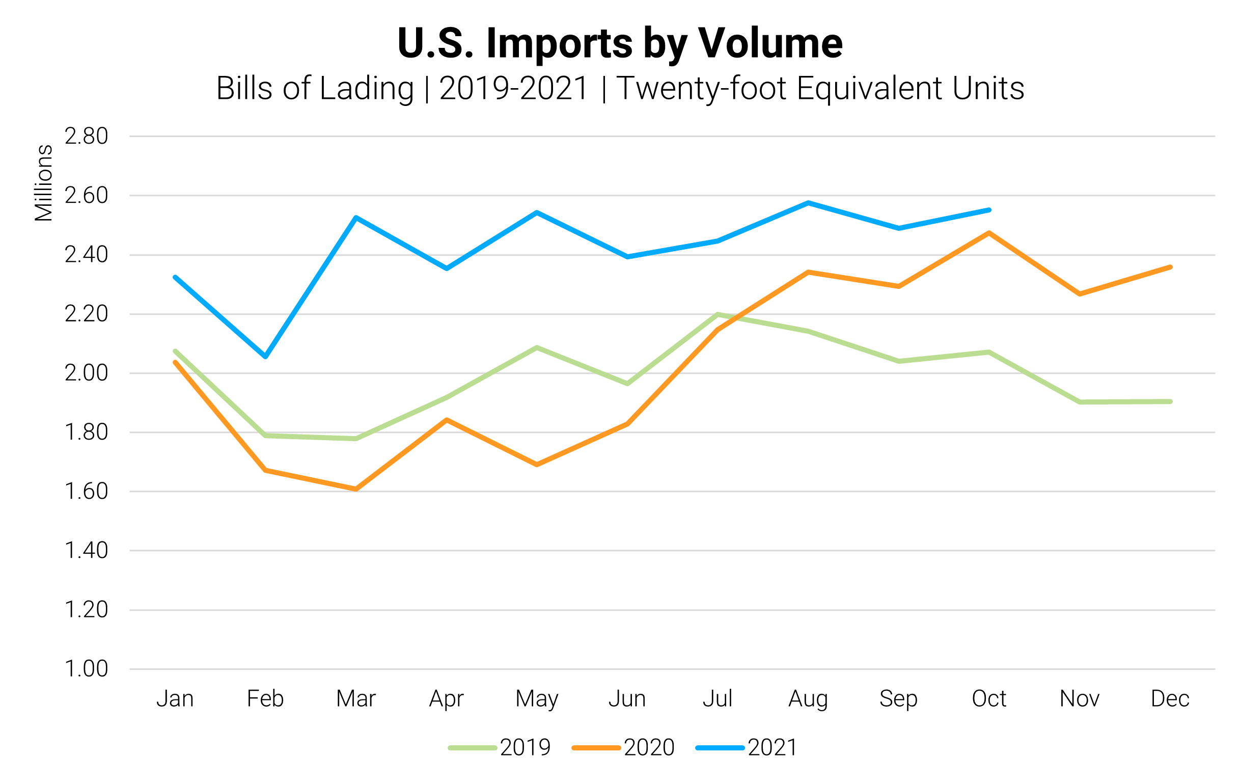 The extended run of high container import volumes and the impact of port wait times has been highly documented by industry and national publications. Wait time at the Port of Los Angeles is down very slightly in October at 14.21 days versus 14.51 days in September and 15.31 days in August. However, wait times in October at East Coast ports are also extensive with the Ports of New York/New Jersey at 8.41 days and the Port of Savannah at 9.71 days.