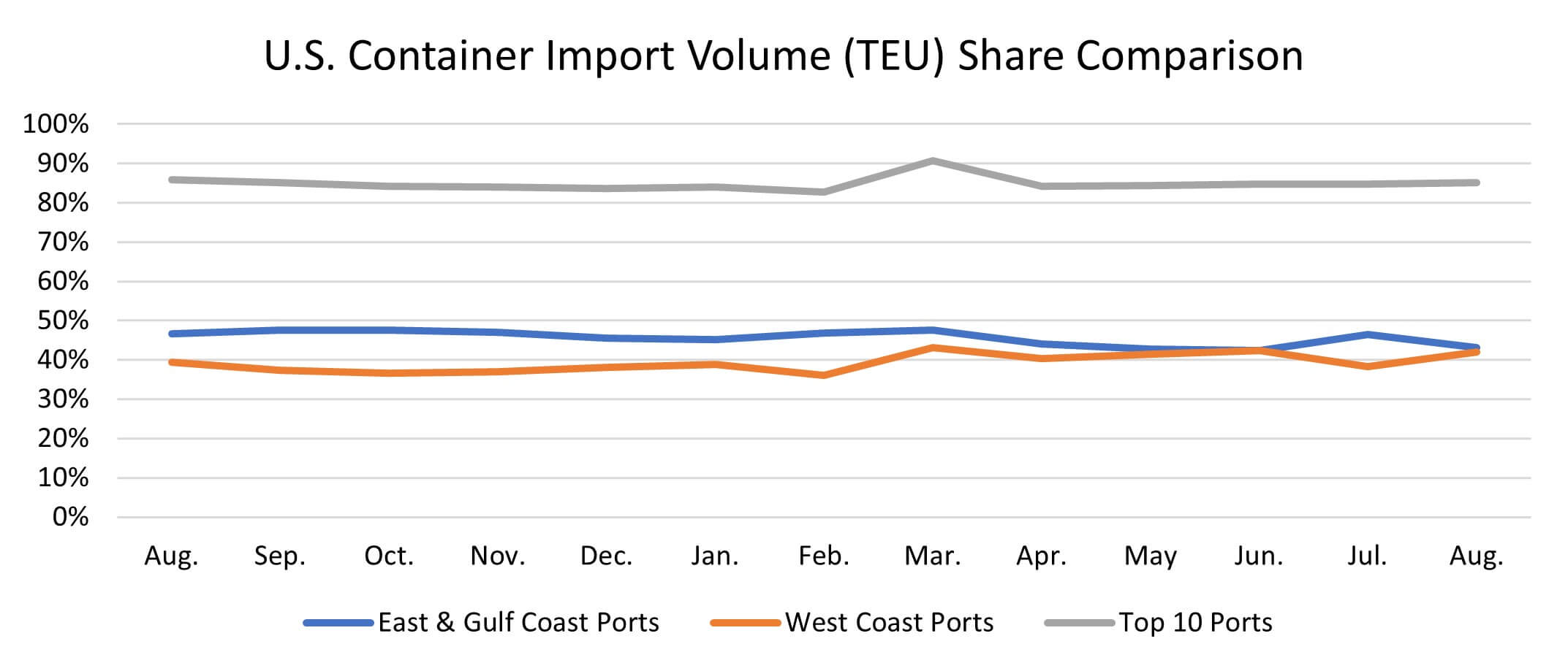 In August 2023, the volume share at top West Coast ports increased based upon the significant volume increase at the Ports of Los Angeles and Long Beach. Comparing the top five West Coast ports to the top five East and Gulf Coast ports in August 2023 versus July 2023 shows that, of the total import container volume, top West Coast ports increased to 41.9% (up 3.6%) and top East and Gulf Coast ports decreased to 43.1% (down 3.3%). Compared to smaller ports, the top 10 ports’ share in August 2023 increased slightly to 85.1%, up 0.4% versus July 2023 (see Figure 6).