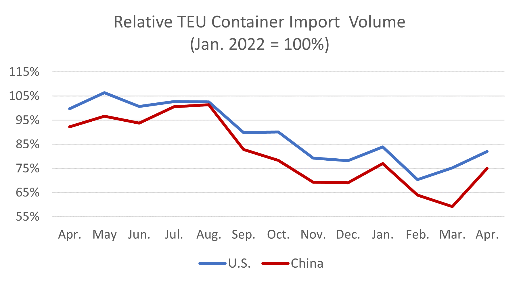 Figure 4: April 2022–April 2023 Comparison of U.S. Total and Chinese TEU Container Volume