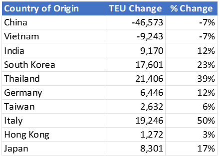 For the top 10 countries of origin, U.S. container import volume in March 2023 increased 2.5% (30,257 TEUs) with Italy (50%), Thailand (39%) and South Korea (23%) having the greatest percentage increases (see Figure 5).