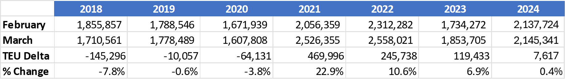 In the previous six years, comparing February to March, import volume varied from small declines to large increases (see Figure 2) with the timing of Chinese Lunar New Year measurably impacting month-over-month container import volumes (Chinese Lunar New Year: 2024: February 11, 2023: January 22, 2022: February 1, 2021: February 12, 2020: January 25, 2019: February 5 and 2018: February 16). In this case, February volumes were not impacted by the Chinese Lunar New Year, but March volumes were and, hence, month-over-month growth appears to be lower than it really was.