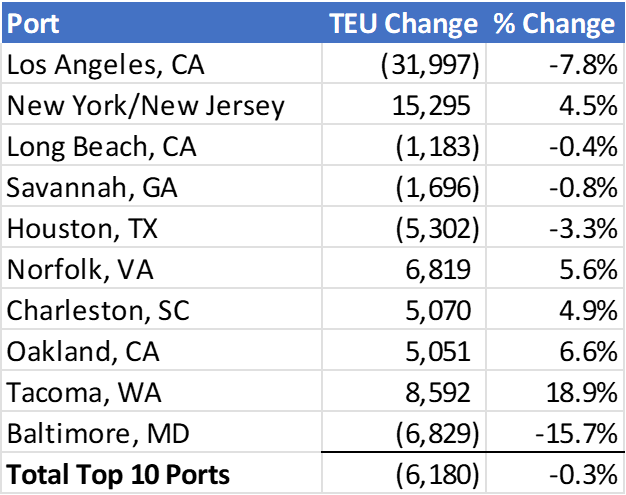 For the top 10 U.S. ports, container import volume in March 2024 was down marginally by 6,180 TEUs (-0.3%) versus February 2024 (see Figure 3). The ports of New York/New Jersey (15,295 TEUs), Norfolk (6,819 TEUs), and Tacoma (8,592 TEUs) experienced the greatest container volume increases from February. The ports of Los Angeles (-31,997 TEUs) and Baltimore (-6,829 TEUs, influenced partially by the collapse of the Francis Scott Key Bridge near the end of March) posted the most significant decreases, with Baltimore representing the largest decrease by percentage (-15.7%). This is the second continuous month where Los Angeles has posted a ~30,000 TEUs decline in month-over-month volume.