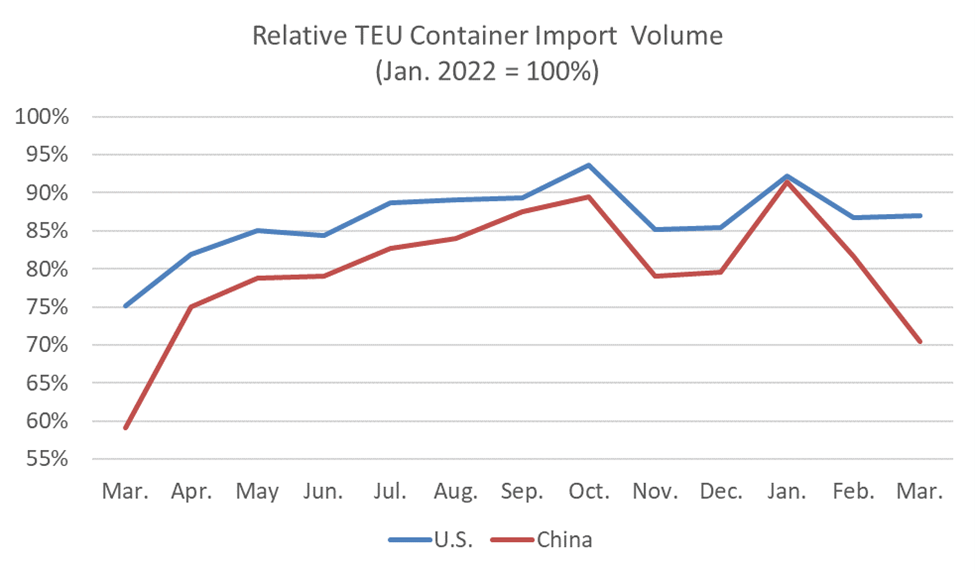 Figure 4: March 2023 – March 2024 Comparison of U.S. Total and Chinese TEU Container Volume