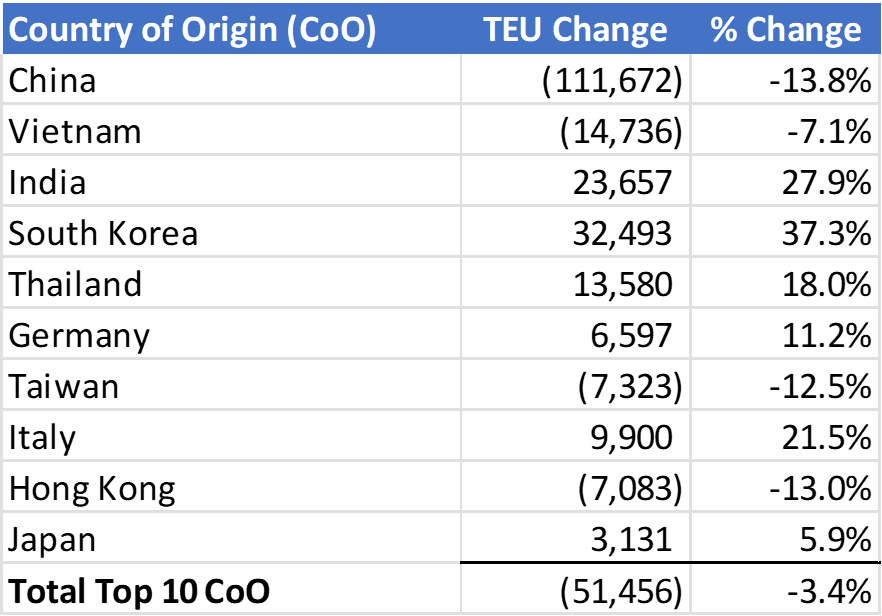 For the top 10 countries of origin (CoO), U.S. container import volume in March 2024 fell 51,456 TEUs, a 3.4% decline from February. Imports from China (-111,672 TEUs) experienced the greatest volume decrease while India (23,657 TEUs) and South Korea (32,493 TEUs) represented the largest volume increases (see Figure 5).