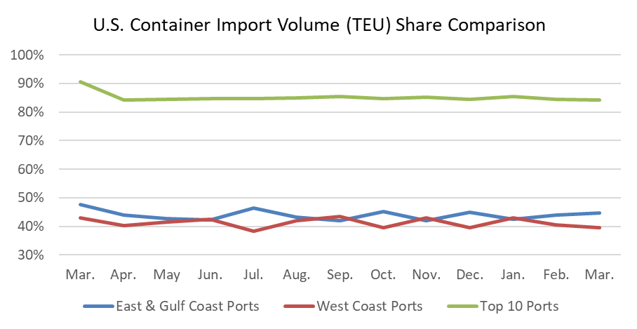 - Panama Canal-based trade flow. The combination of the drought impacting capacity and the recently ratified International Longshore and Warehouse Union (ILWU) could accelerate the redirection of the one million TEUs that shifted from the West Coast ports during the pandemic. Container volume in March at top East Coast ports was up slightly while top Gulf Coast Ports was flat. Top East and Gulf Coast port transit times were unchanged.
