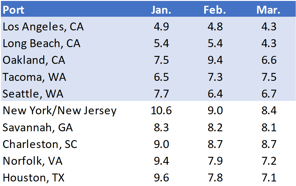 In March, port delays show continued improvement.