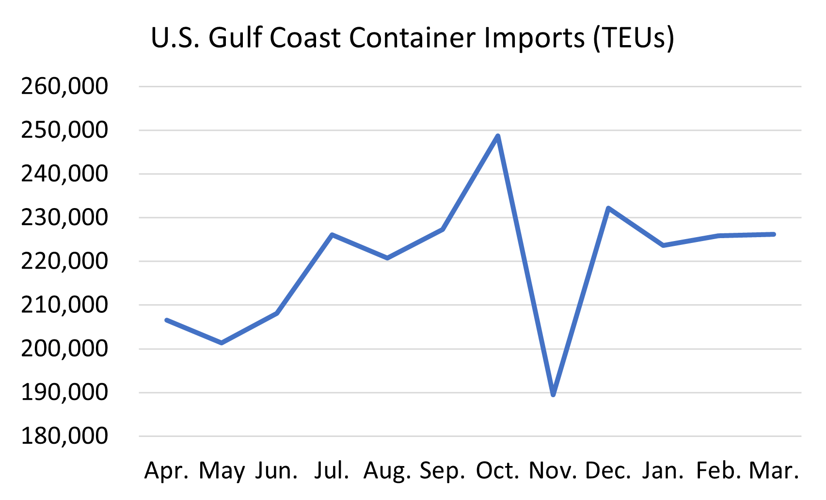 - Monthly TEU volumes between 2.4M and 2.6M. This level will continue to stress ports and inland logistics until infrastructure improvements are made. March U.S. container import volumes remained manageable, near 2.1M TEUs.