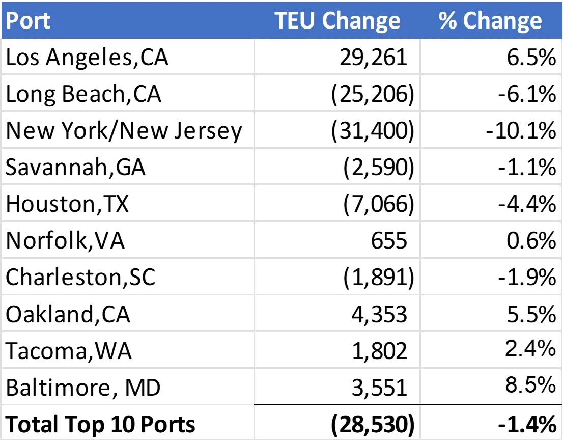 Figure 3: November 2024 to December 2024 Comparison of Import Volumes at Top 10 U.S. Ports