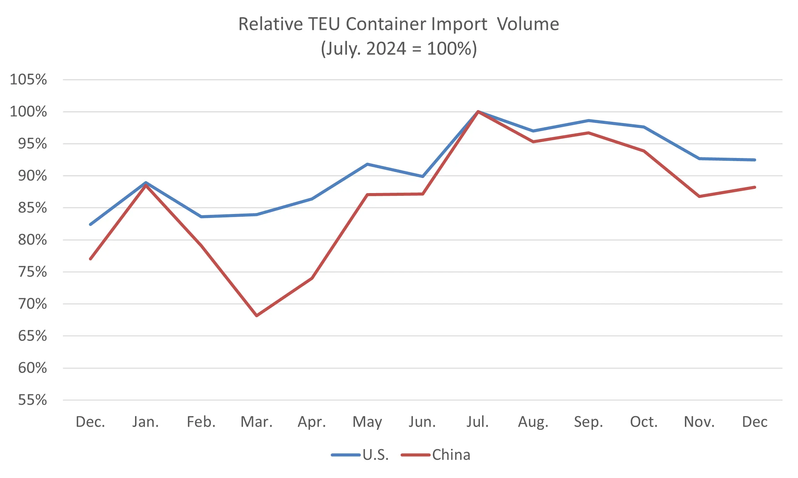 Figure 4: December 2023–December 2024 Comparison of U.S. Total and Chinese TEU Container Volume Relative to Chinese Import Record