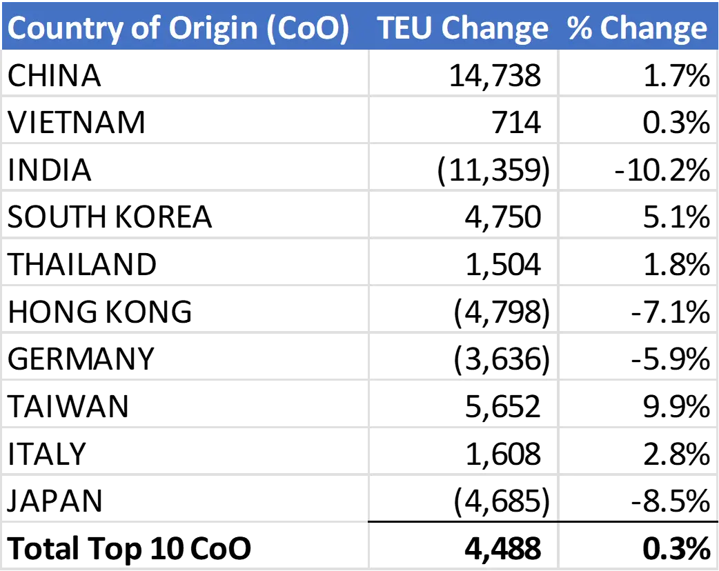 In December 2024, U.S. container import volume from the top 10 countries of origin (CoO) increased by 4,488 TEUs, representing a 0.3% increase from November (see Figure 5). Among these countries, China (up 14,738 TEUs), Taiwan (up 5,652 TEUs), and South Korea (up 4,750 TEUs) experienced the largest volume increases. In contrast, India (down 11,359 TEUs), Hong Kong (down 4,798 TEUs), and Japan (down 4,685 TEUs) recorded the most significant volume decreases.