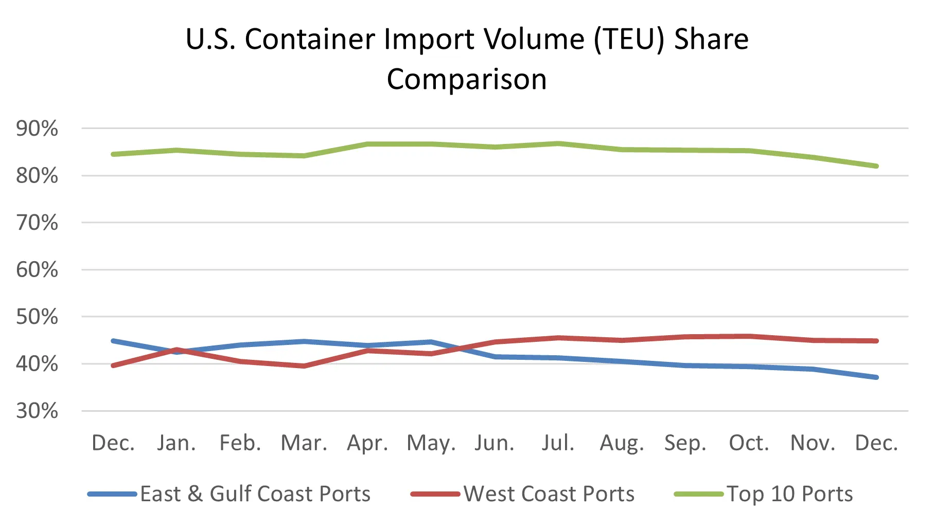 West Coast ports maintain dominance in U.S. container import volumes.
