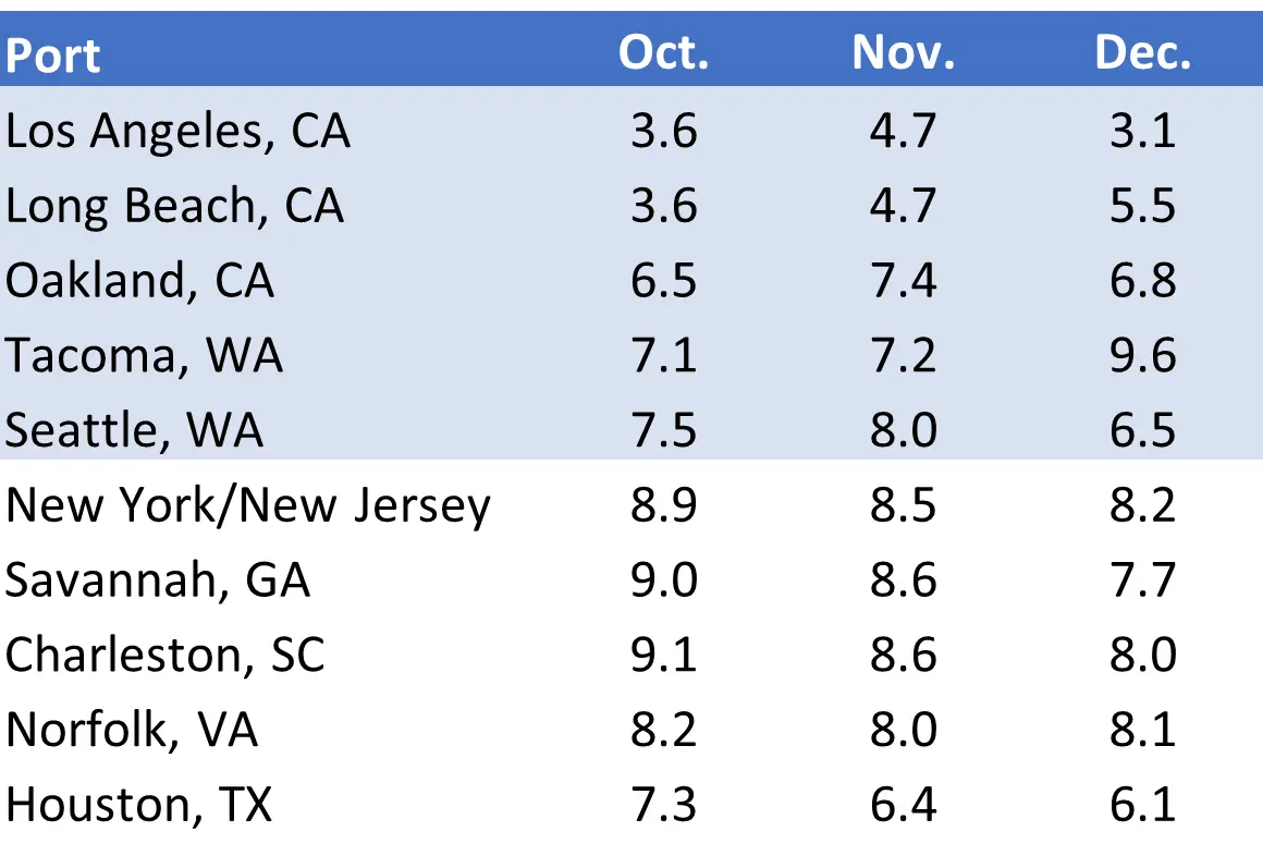 Overall, transit delays have decreased across the top 10 U.S. ports, with notable improvements on the East Coast. On the West Coast, Tacoma and Long Beach experienced the most significant increases, with delays rising by 2.4 days and 0.8 days, respectively. Other West Coast ports showed improved transit times, with the largest reductions in delays seen at the Port of Los Angeles, which improved by 1.6 days, and Seattle, which saw a 1.4-day decrease. Despite some regional fluctuations, delays across the top U.S. ports generally trended positively in December.