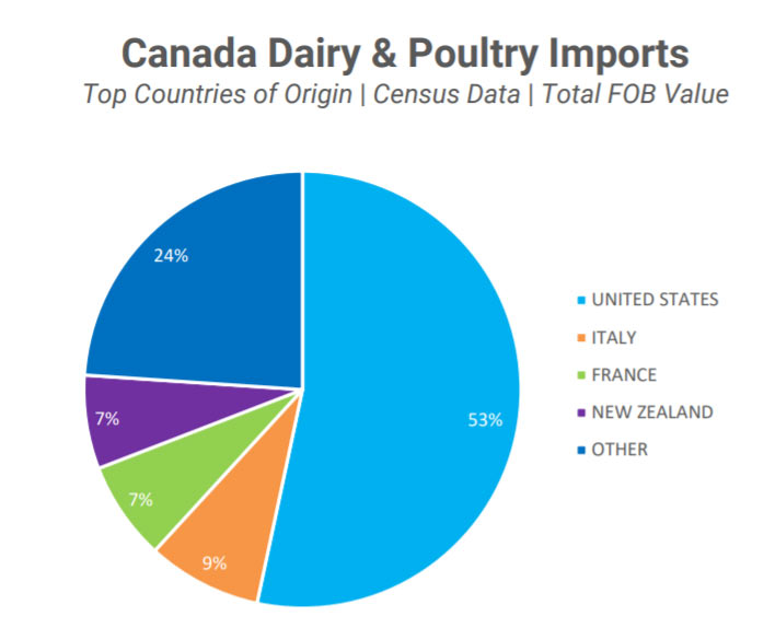 - U.S. poultry and dairy exports to Canada, thought to have the largest impact in export values by many, have only seen a mild increase compared to 2018 and 2019. In the second half of 2020, U.S. dairy farmers made up 3.6 percent of Canada’s total dairy market, up from ~1 percent under NAFTA.