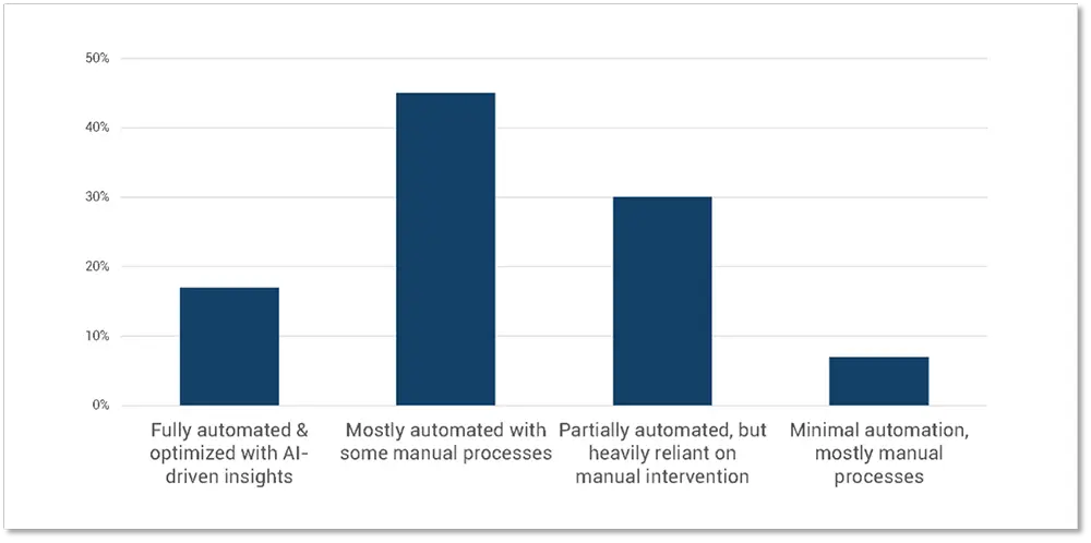 While transportation management systems (TMS) are increasingly recognized as an essential solution in modern technology environments for shippers and LSPs, significant gaps remain in automation and digital maturity. Only 17% of respondents report being fully automated, with over one-third heavily or mostly reliant on manual processes (see Figure 1). This digital gap is especially pronounced between companies with industry leading financial performance (51% fully automated processes) and those with below average financial performance (5% fully automated processes) who trail significantly in automation, artificial intelligence (AI) adoption and growth expectations.