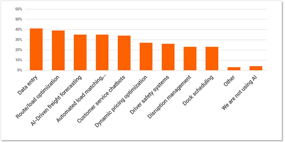In terms of adopting generative AI specifically, an overwhelming 96% of overall respondents indicated they are using it within their operations, with the top three use cases cited as data entry (41%), route/load optimization (39%), and AI-driven freight forecasting and automated load matching/capacity sourcing (both 35%) (see Figure 2). The 4% of respondents not using generative AI were much more likely to view transportation management as a necessary evil and more likely to expect limited to no growth over the next two years.