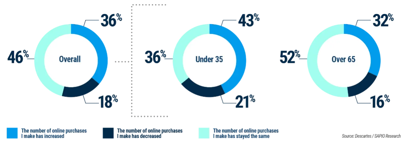 LONDON, U.K. and ATLANTA, Georgia, May 14, 2025 (GLOBE NEWSWIRE) -- Descartes Systems Group (Nasdaq:DSGX) (TSX:DSG), the global leader in uniting logistics-intensive businesses in commerce, released findings from How Smarter Home Delivery Wins Younger Consumers as Online Buying Slows, its fourth annual consumer sentiment study of ecommerce home delivery. The study shows that, in a slower growing ecommerce market, consumers aged 18-35 (“under 35s”) are the biggest contributor to online growth, increasing both the volume and frequency of their purchases over the last 12 months compared to the prior year. While 18% of overall consumers surveyed cut back on purchases during this period, 43% of under 35s increased their spending year-on-year compared to just 32% of over 65s (see Figure 1).