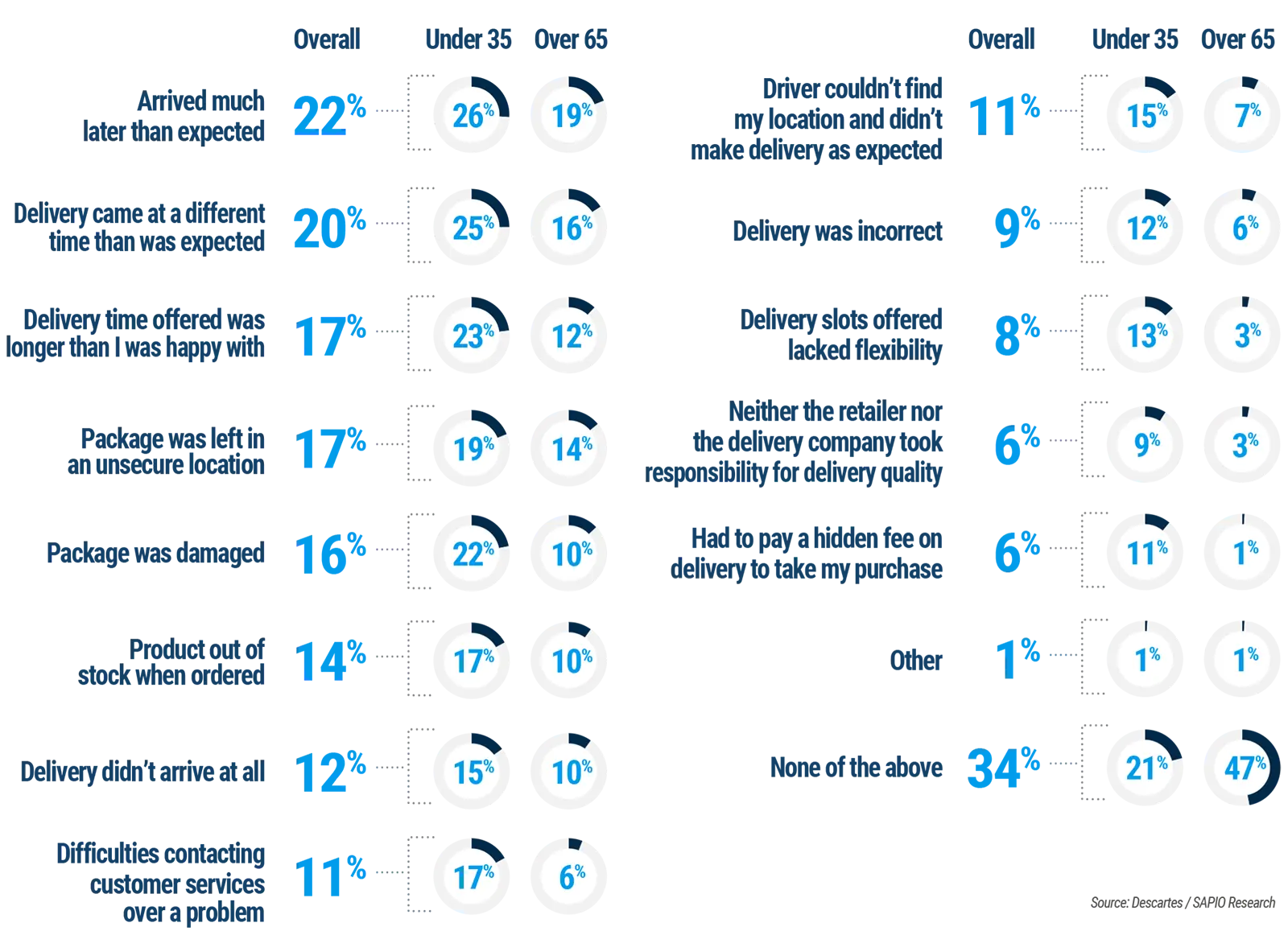 Moreover, for each delivery problem detailed in the survey, under 35s reported a higher percentage of negative experiences than overall respondents (see Figure 2). Conversely, over 65s reported a lower percentage of negative experiences than all respondents. Not only is the younger demographic the cohort driving growth in online purchasing, it also appears to be the group with the highest expectations for positive delivery experiences.