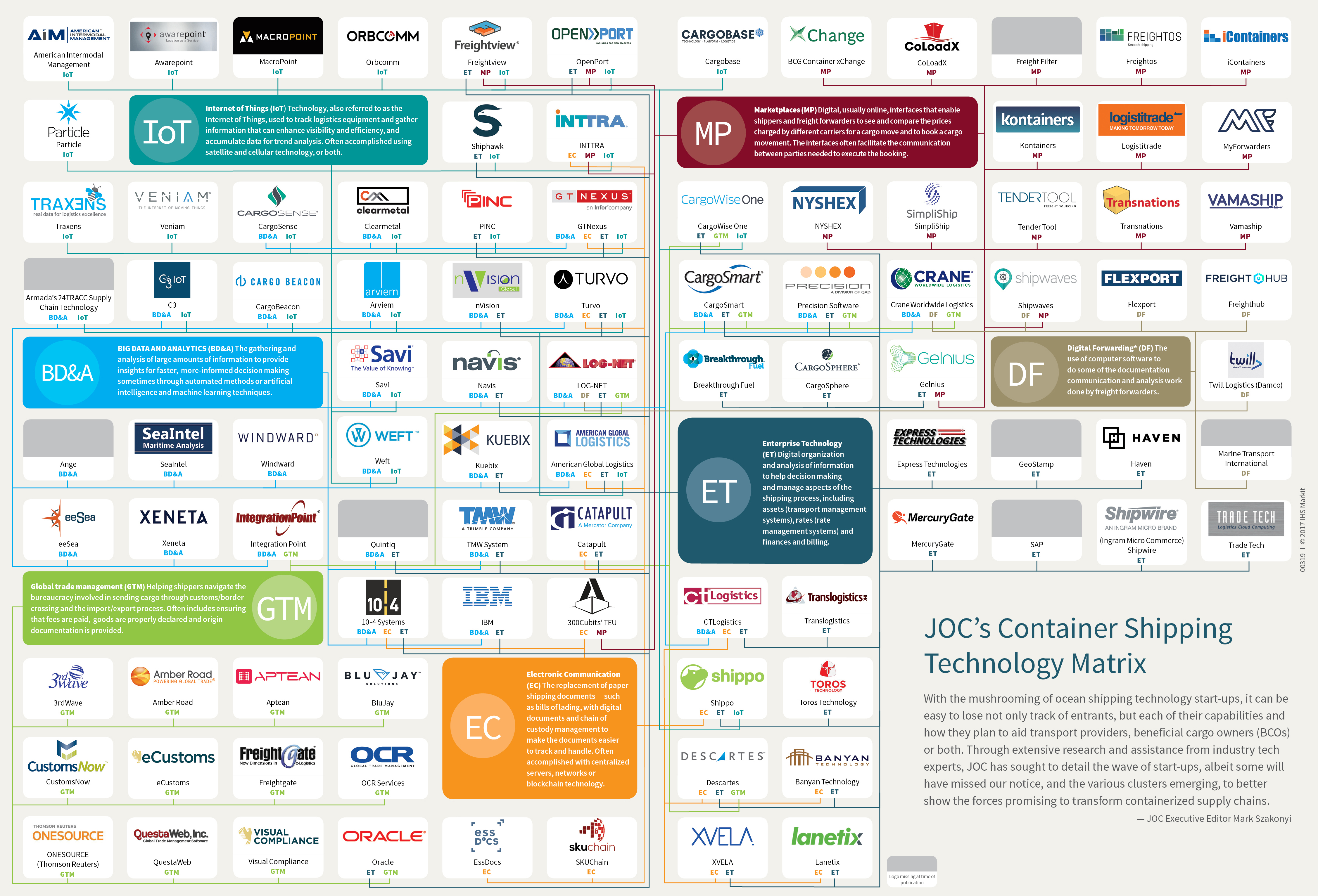 After extensive research and assistance from industry tech experts, the Journal of Commerce has released it Container Shipping Technology Matrix depicting the technologies and companies engaged in transforming containerized supply chains. Descartes is featured in the categories of Global Trade Management, Enterprise Technology and Electronic Communication.